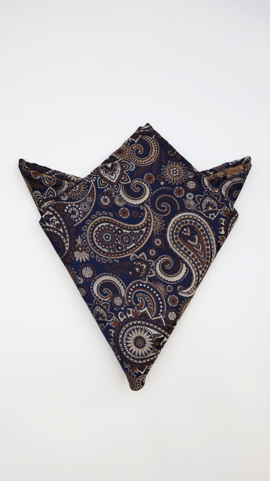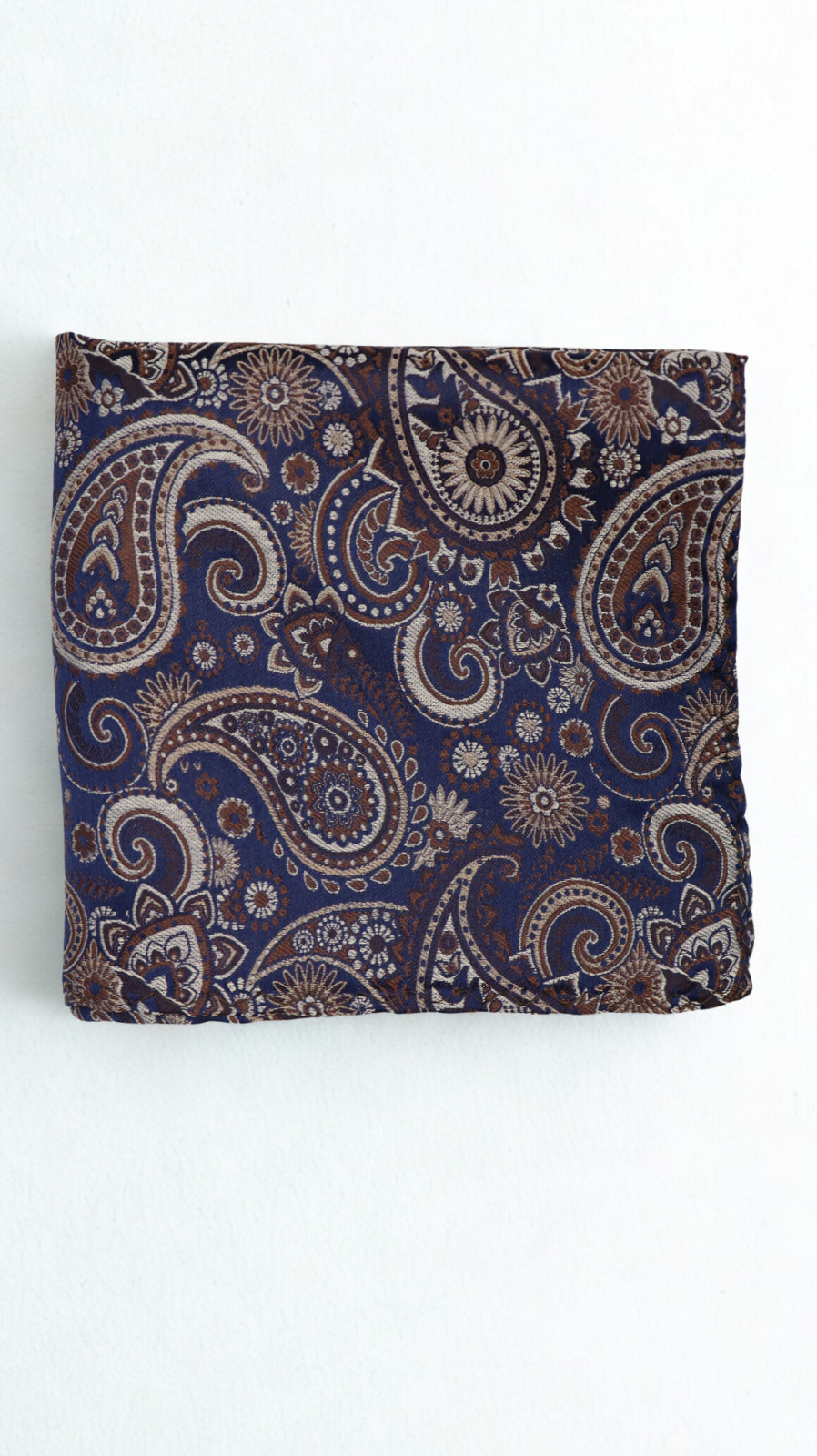 Această batistă ESCUDO din mătase naturală impresionează printr-o estetică mai profundă și mai sofisticată, construită în jurul unui fundal bleumarin intens, pus în valoare de detalii paisley în nuanțe de bej cald și maro elegant. Este o piesă care inspiră rafinament discret și maturitate stilistică.