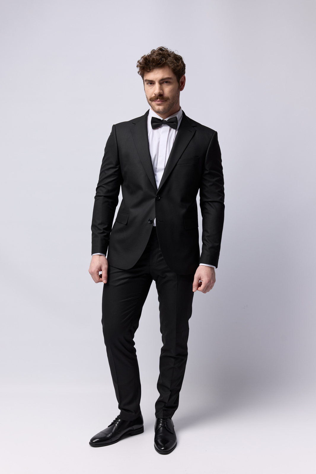 Descoperă eleganța atemporală cu acest costum slim fit negru din stofă fină de calitate superioară, compus din sacou și pantaloni. Designul și croiala modernă slim fit se îmbină perfect pentru a crea o siluetă impecabilă care evidențiază linia corpului.