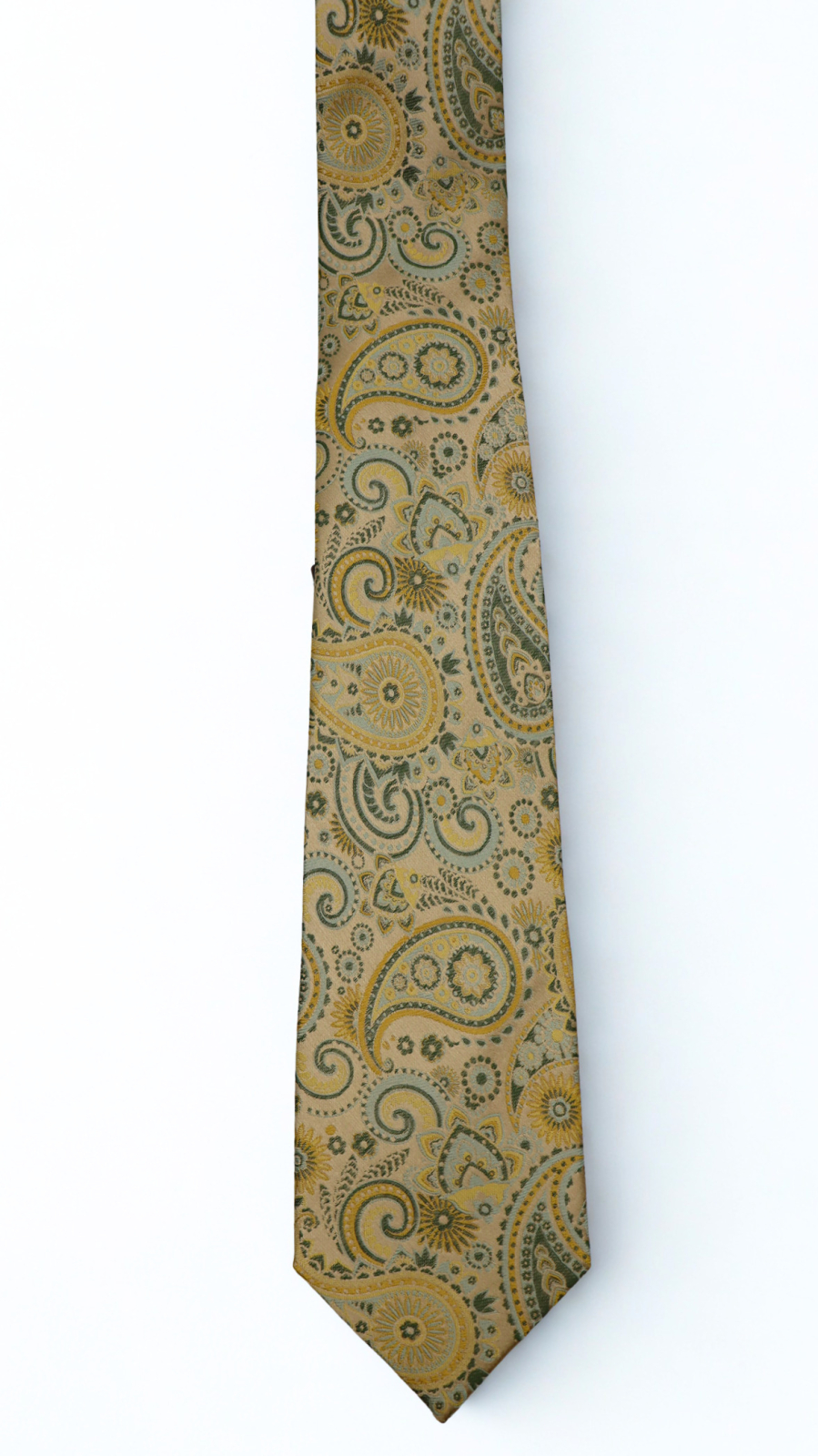 Această cravată ESCUDO are personalitatea unui accesoriu care știe exact ce vrea. Pe un fond auriu-camel cald, un model paisley bogat se desfășoară în galben auriu, verde salvie deschis - o paletă terestră și luminoasă în același timp, cu rozete florale precise și arabescuri care umplu fiecare centimetru de țesătură. Rezultatul este o cravată cu o energie distinctă, perfectă pentru bărbatul care apreciază natura culorilor și nu se teme să le poarte.