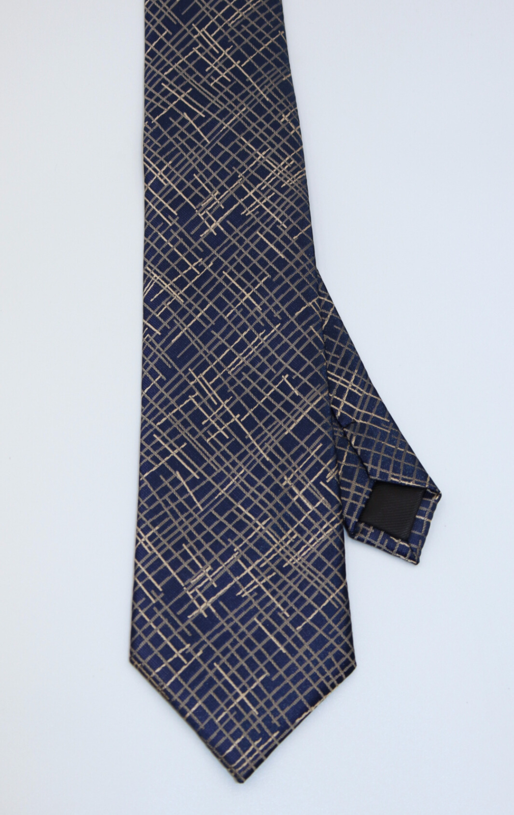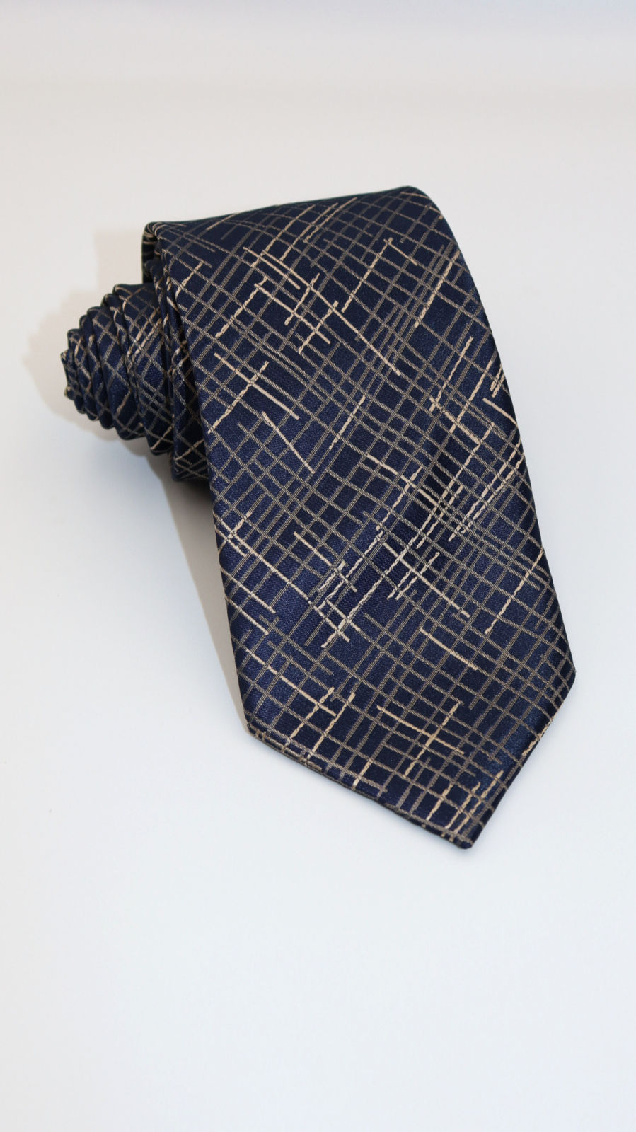 Uneori cel mai puternic statement vine din simplitate. Această cravată ESCUDO renunță la modelele elaborate în favoarea unui model liniar diagonal auriu-bej pe fond navy profund - linii libere, ușor neregulate, care creează un efect aproape artizanal. Rezultatul este o cravată cu un caracter graphic și modern, care se distinge imediat într-o garderobă dominată de modele clasice.