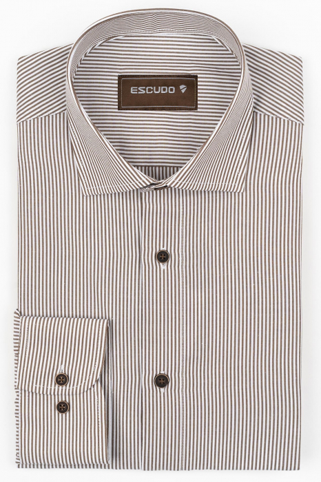 Modelul în dungi maro conferă verticalitate și dinamism vizual, făcând ca această cămașă să fie potrivită atât sub sacouri pentru o apariție formală, cât și cu pantaloni casual pentru un look mai relaxat, dar plin de personalitate