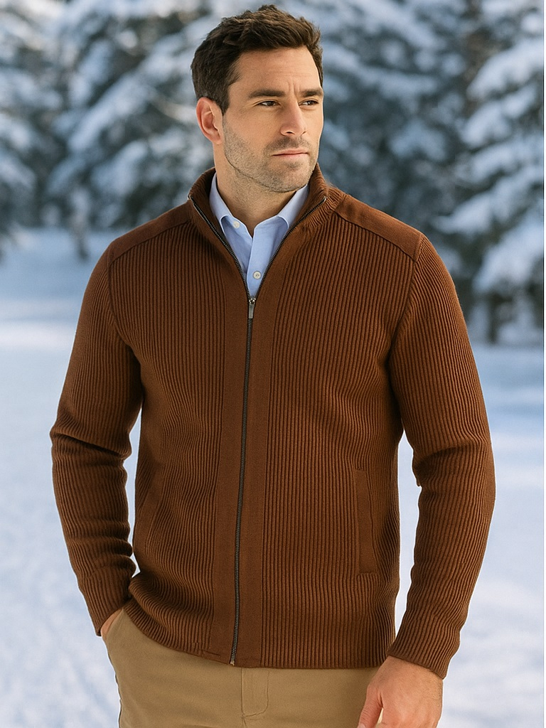 Jachetă maro cu fermoar și detalii din material fin – eleganță și confort într-o singură piesă