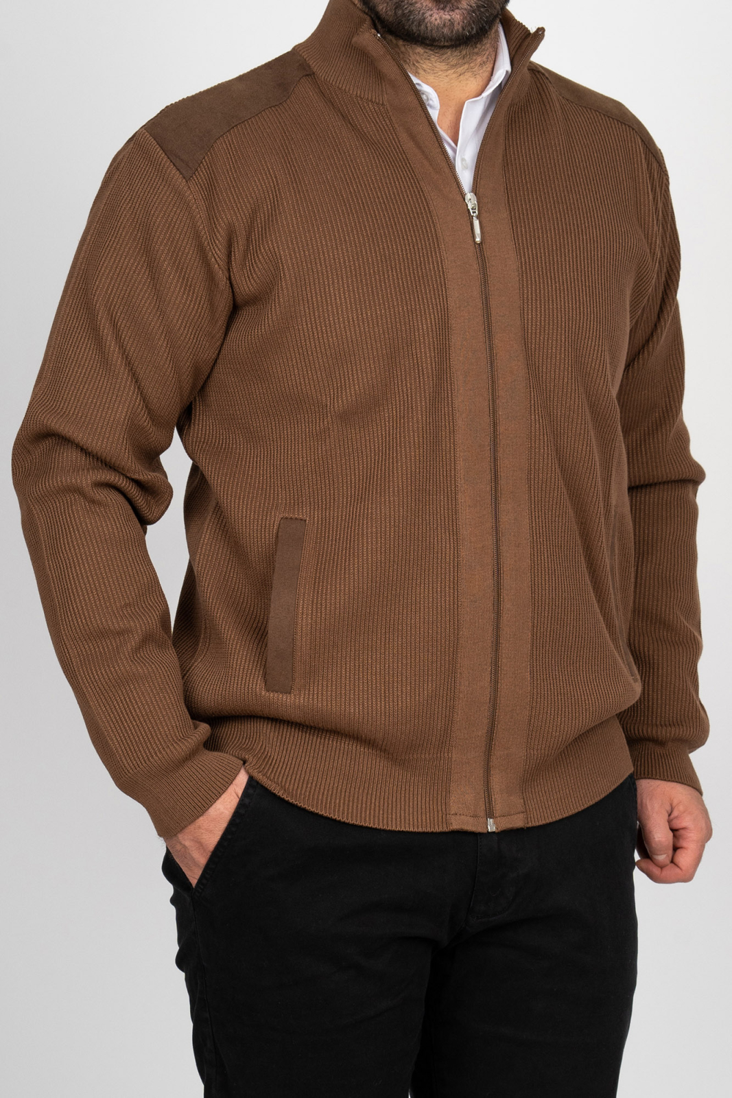 Jachetă maro cu fermoar și detalii din material fin – eleganță și confort într-o singură piesă