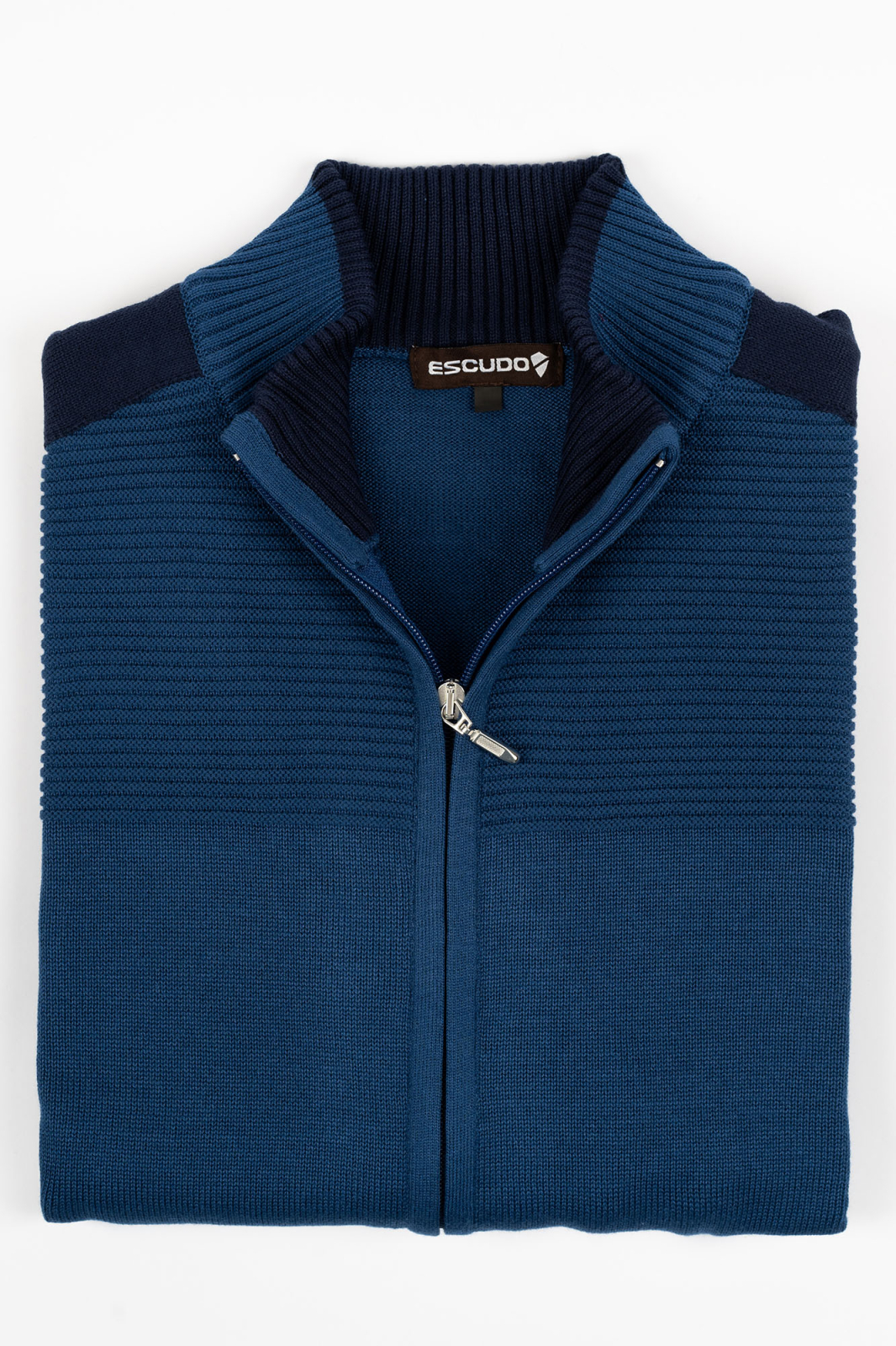 Această jachetă albastra, realizată din tricot de calitate superioară, îmbină stilul clasic cu un design modern. Textura ribbed adaugă un plus de rafinament.