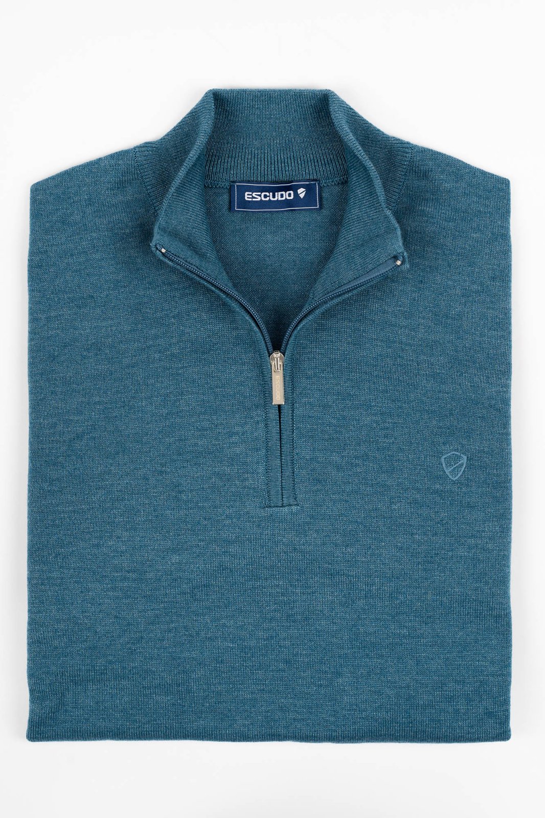Pulover casual turcoaz, croi slim fit, cu guler inalt prevazut cu fermoar pentru barbati. Acest pulover reprezinta o alegere excelenta pentru a imbina stilul si confortul in sezonul rece. Poti integra cu usurinta acest pulover atat in tinutele de birou cat si in cele casual.